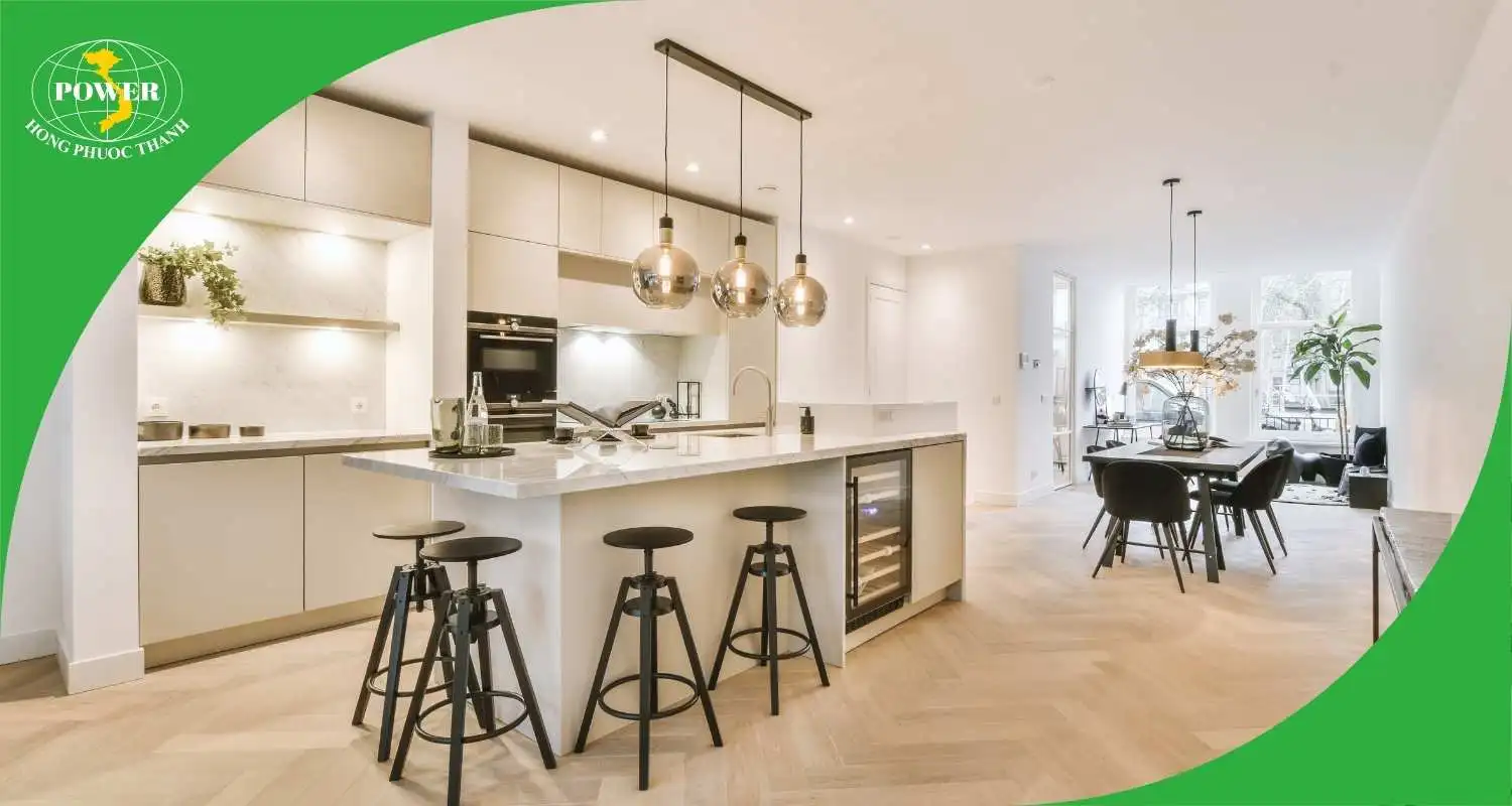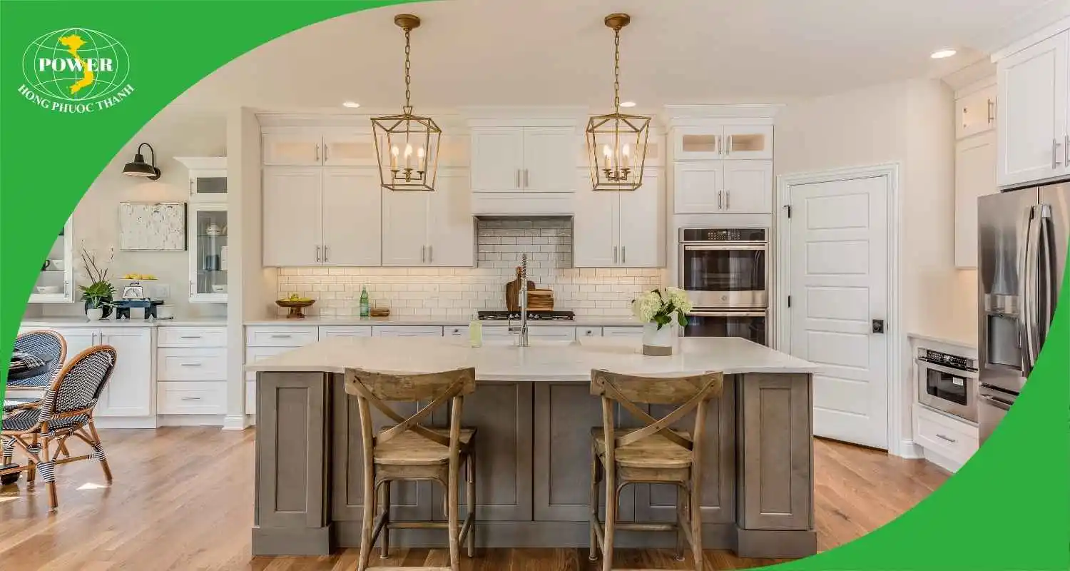 - Đèn thả trần, thường treo trên đảo bếp hoặc bàn ăn để mang đến không gian ấm cúng.