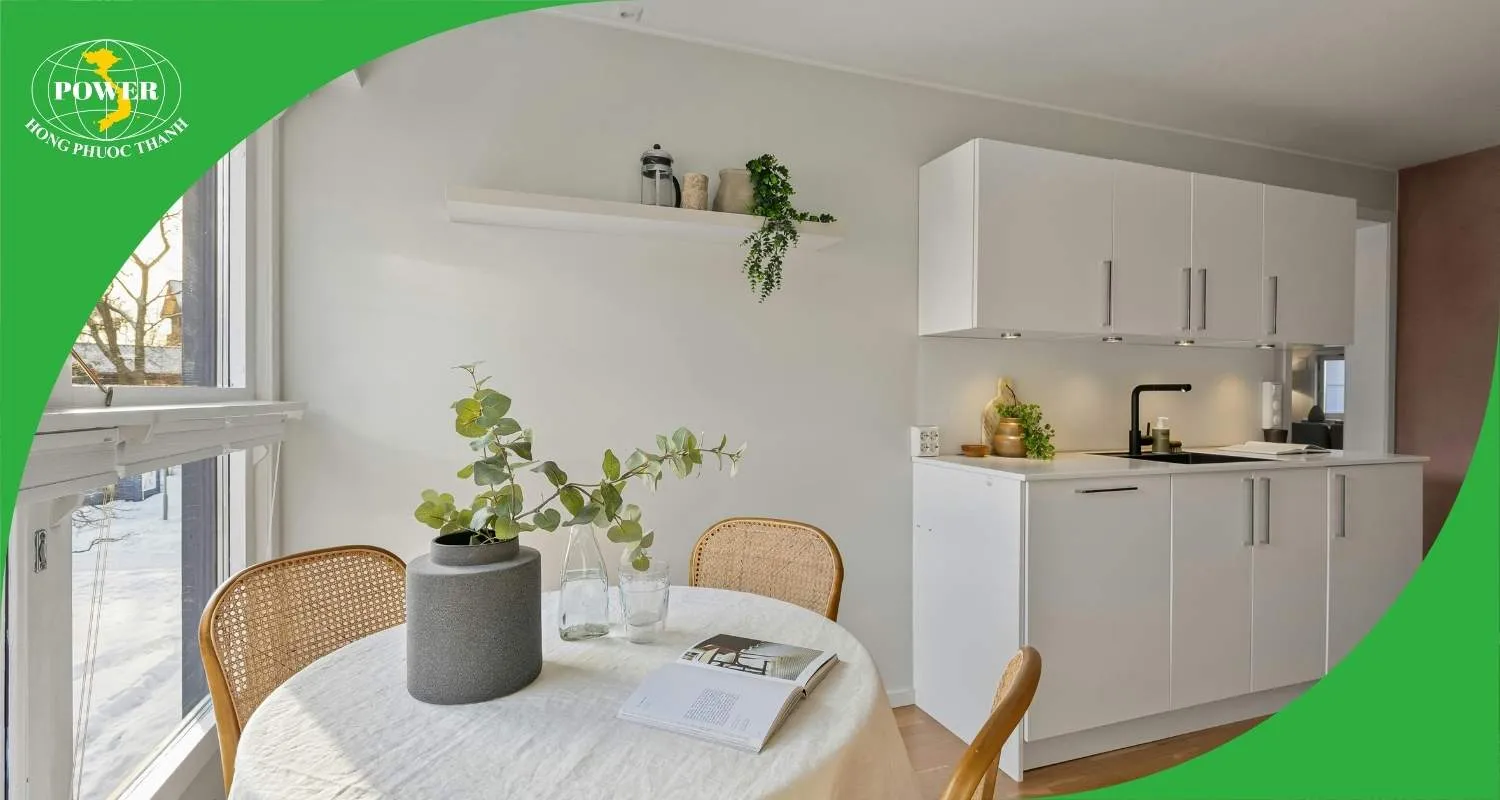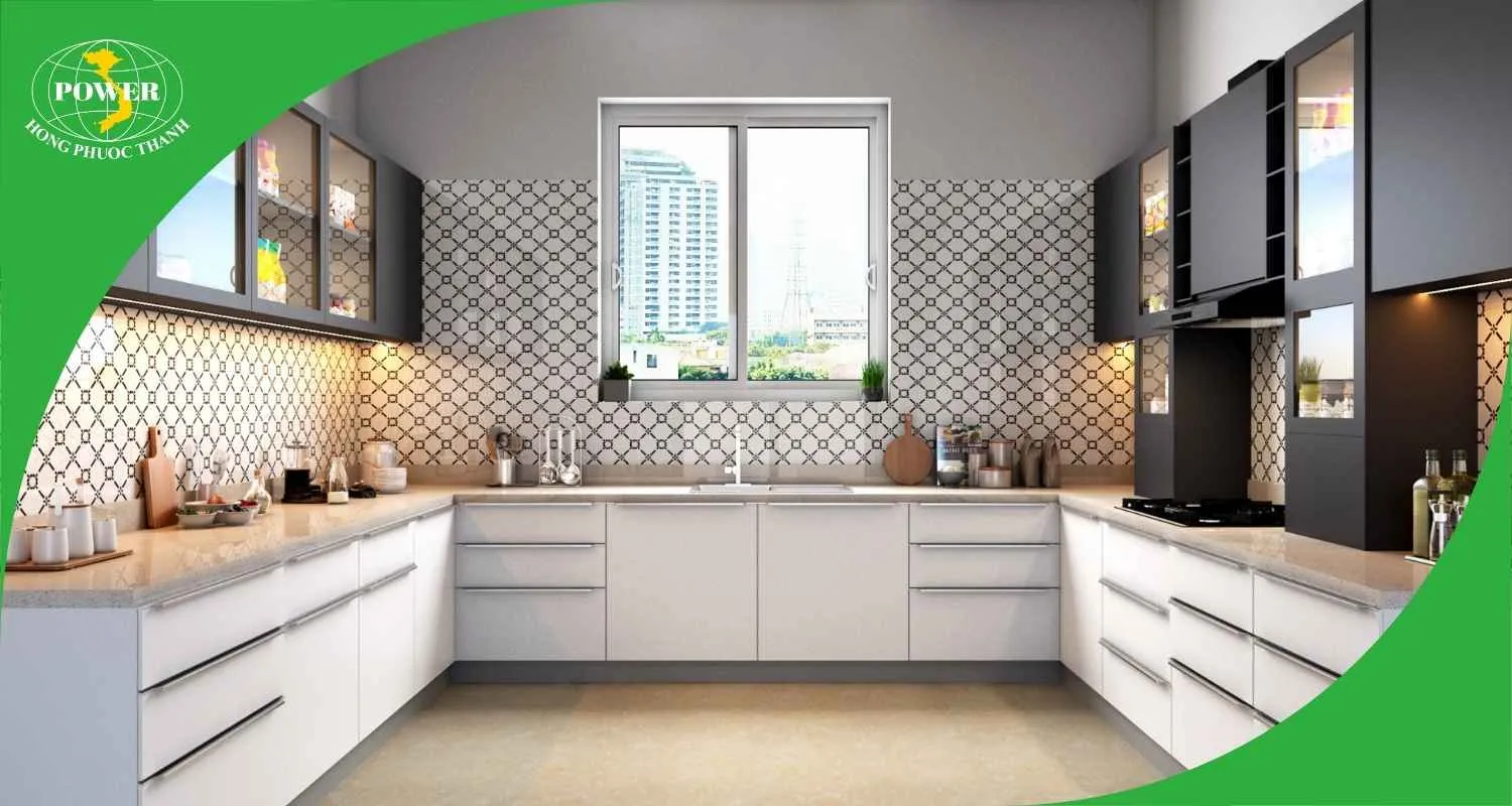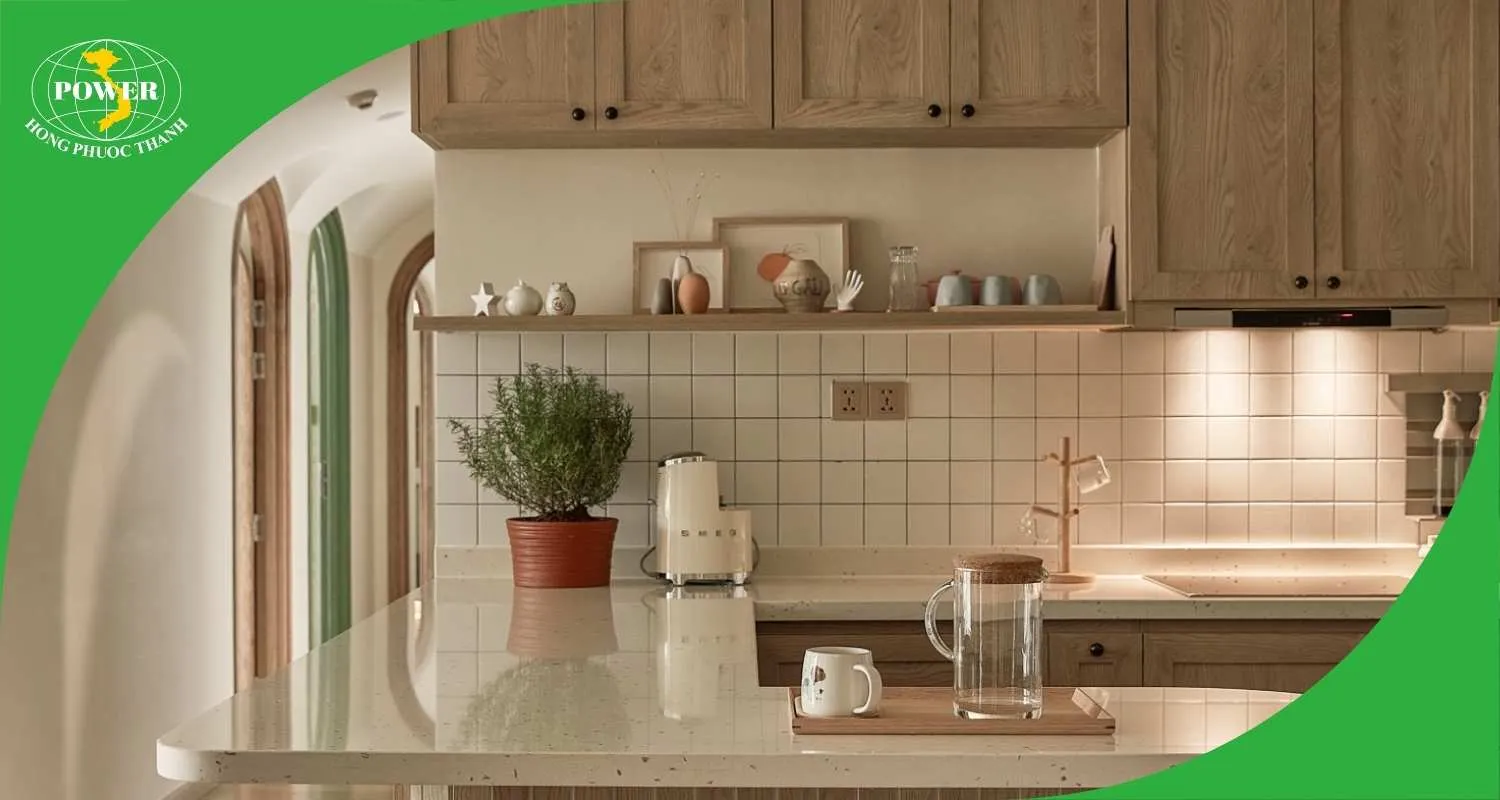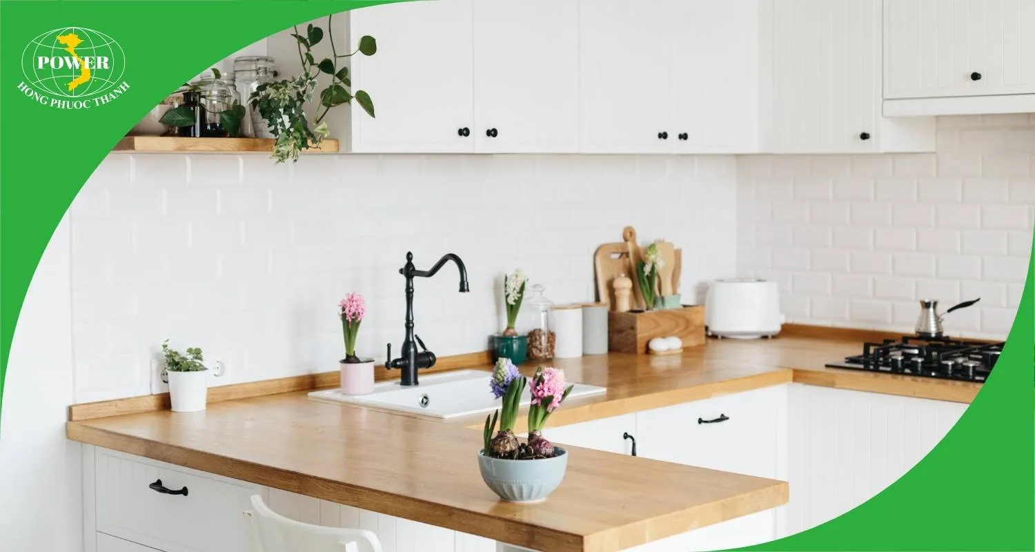 - Tính thẩm mỹ và cá nhân hóa: Trang trí thêm cây xanh kết hợp tạo điểm nhấn bằng gạch ốp tường, backsplash hoa văn hoặc tay nắm tủ độc đáo,…