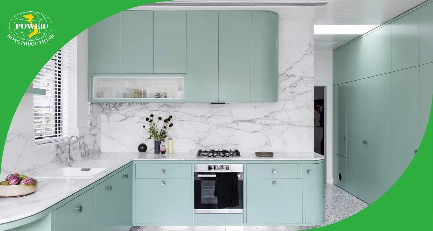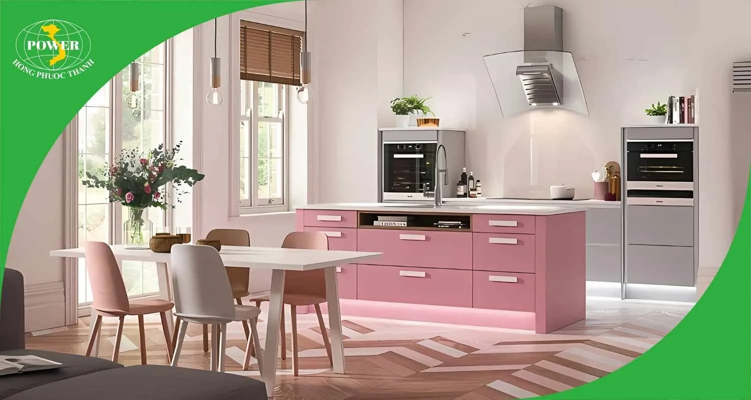 Mẫu nhà bếp đẹp kế tiếp là mẫu nhà bếp có tone màu pastel, dành cho những ai yêu thích sự dịu dàng và thanh thoát. Một số gam màu mang lại cảm giác thư giãn mà bạn có thể tham khảo: hồng phấn, xanh mint, kem sữa, vàng nhạt,…