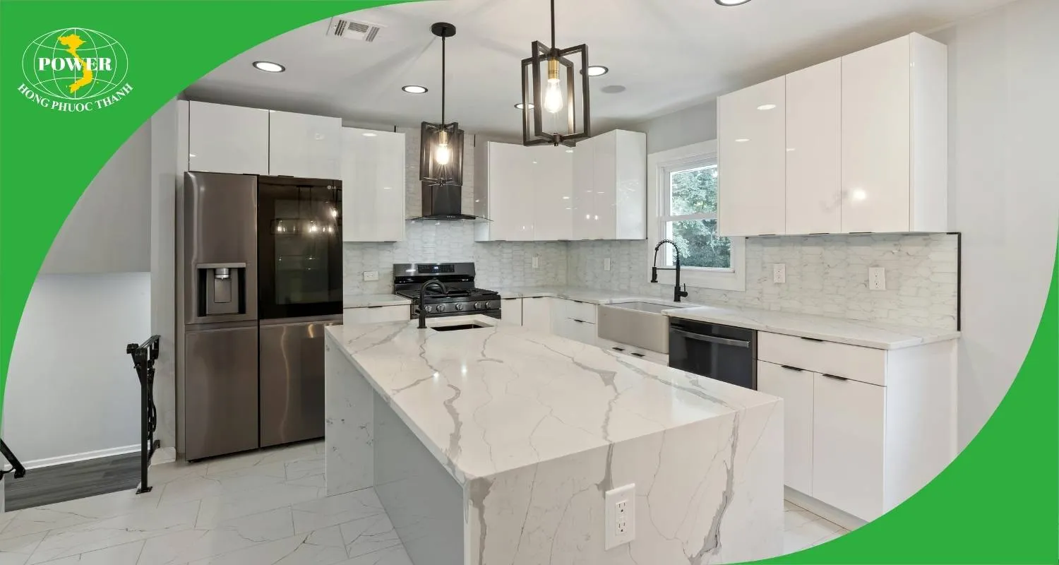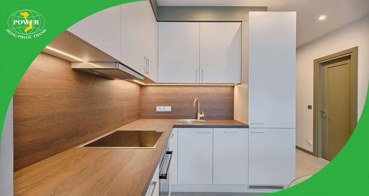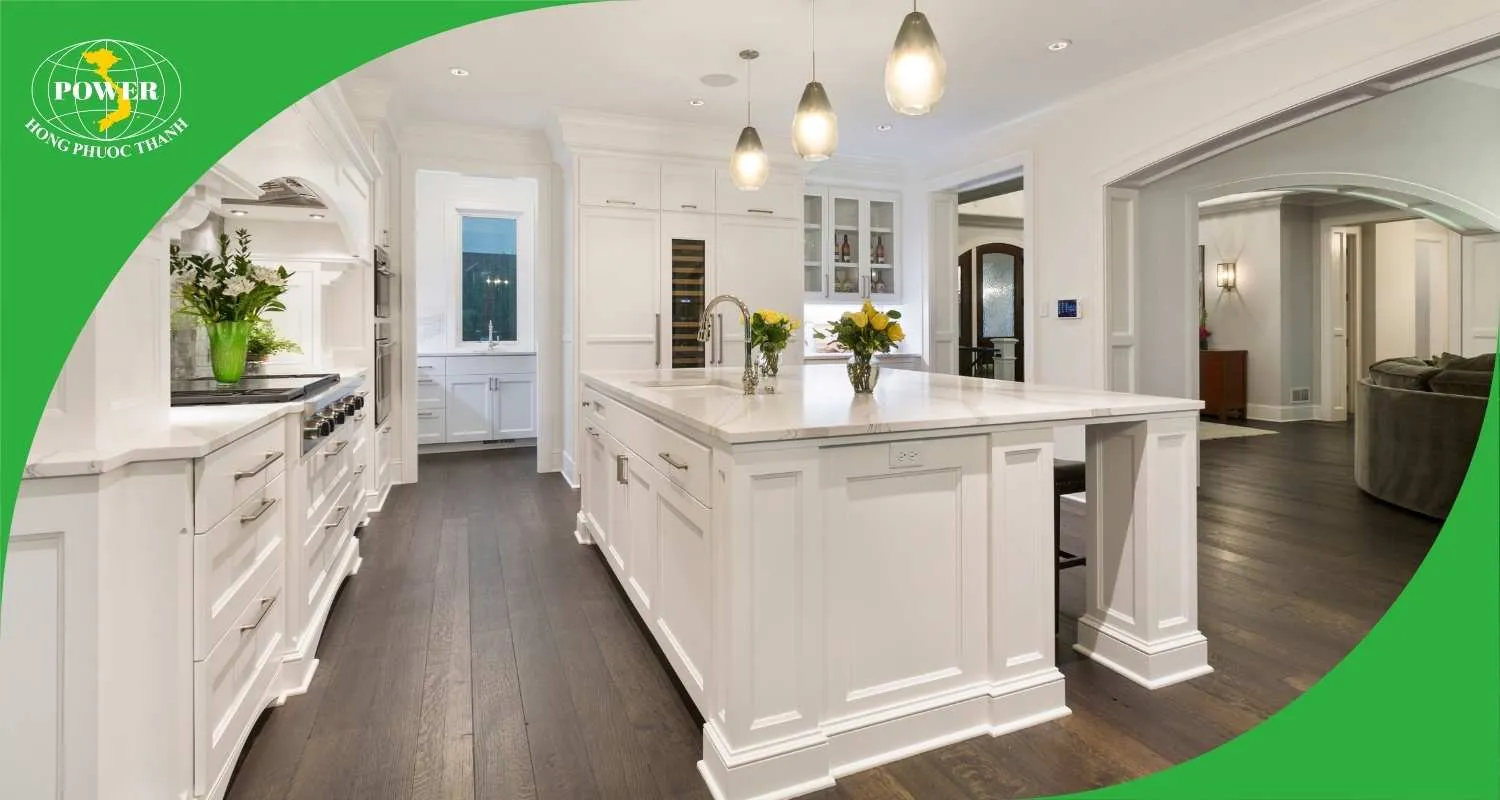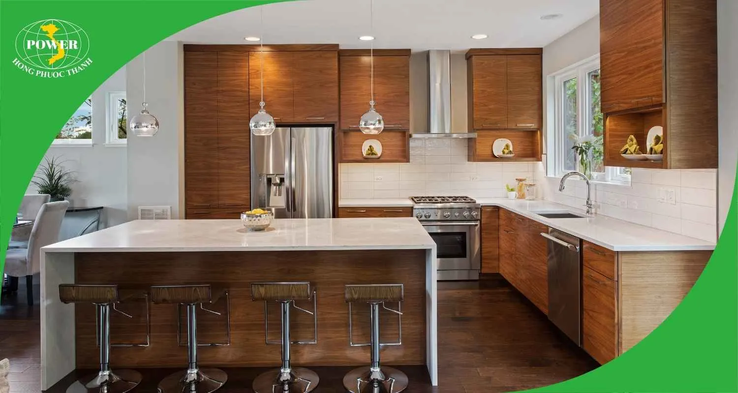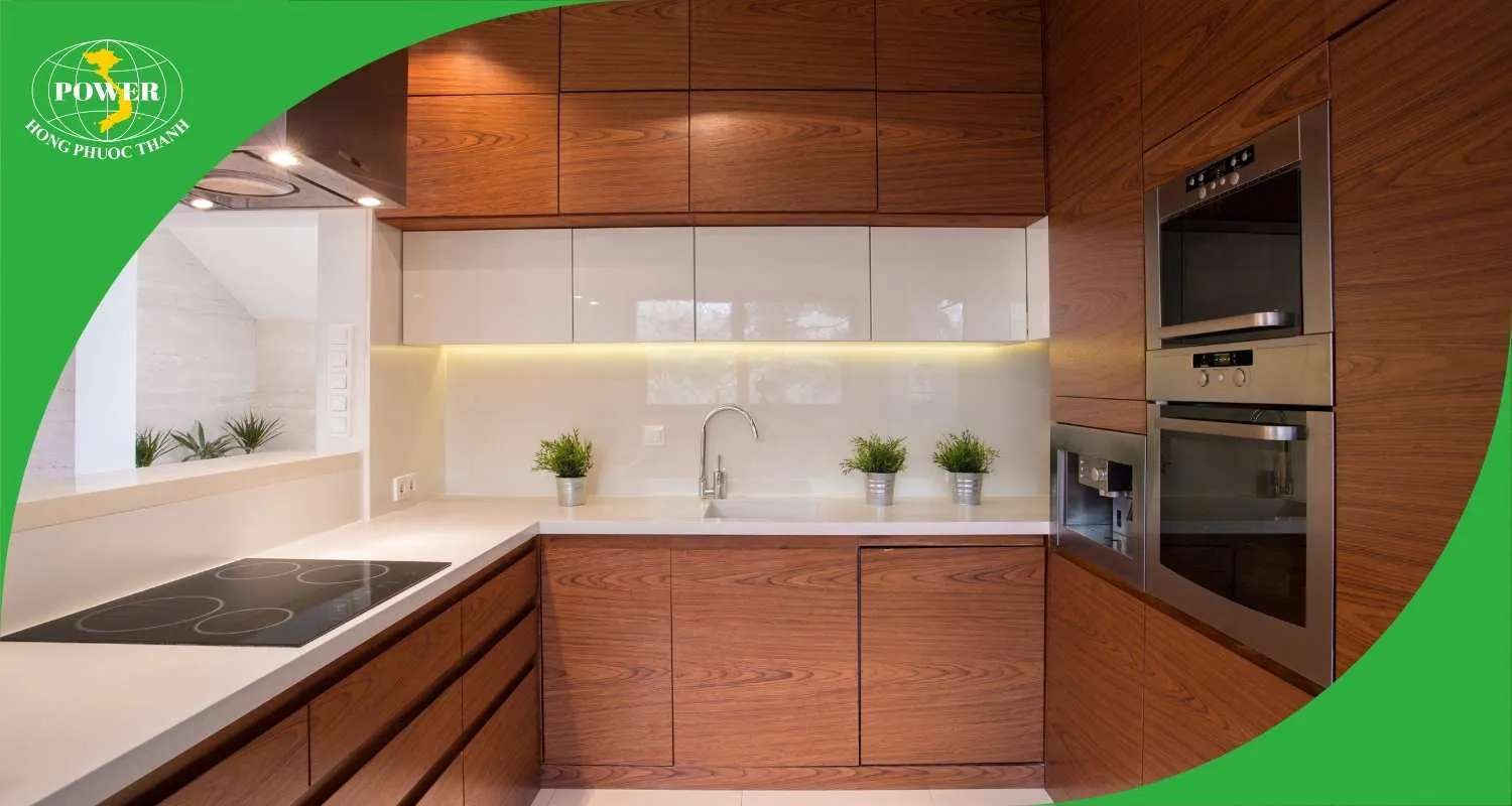 - Vật liệu chất lượng: Chẳng hạn như sử dụng tủ bếp có chất liệu là gỗ tự nhiên, mặt bếp được làm từ đá nhân tạo hay kính cường lực,…