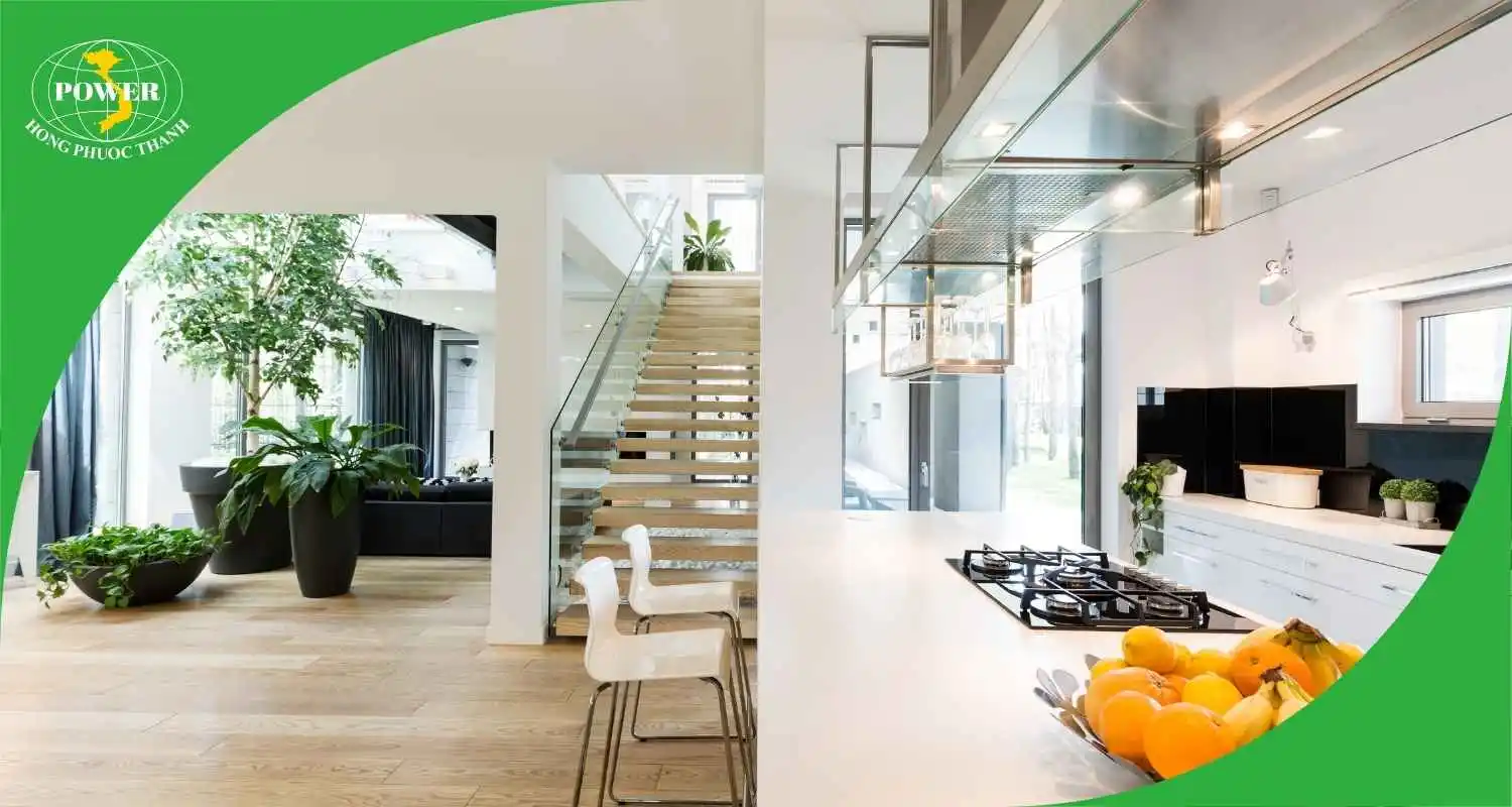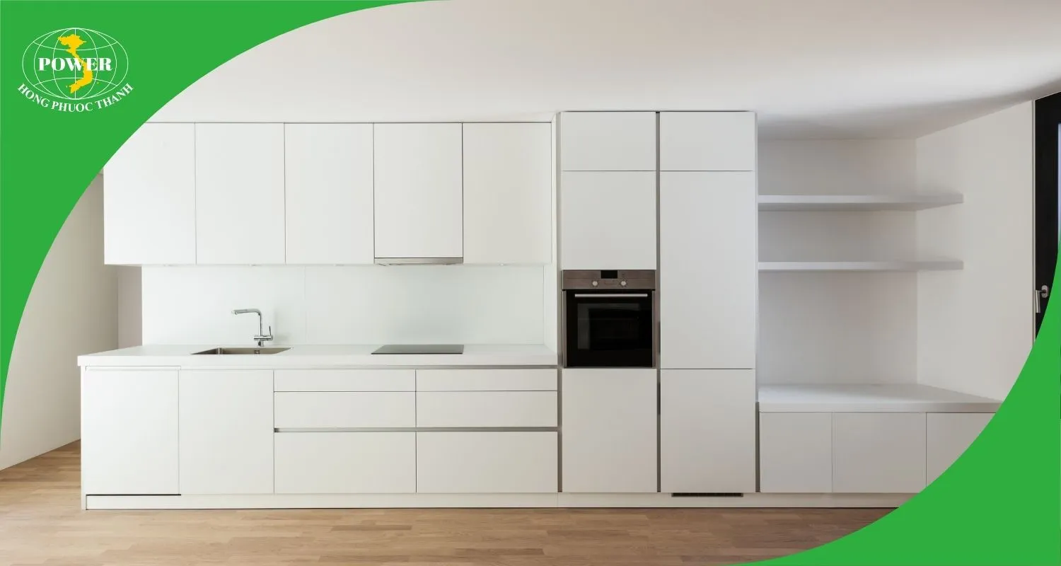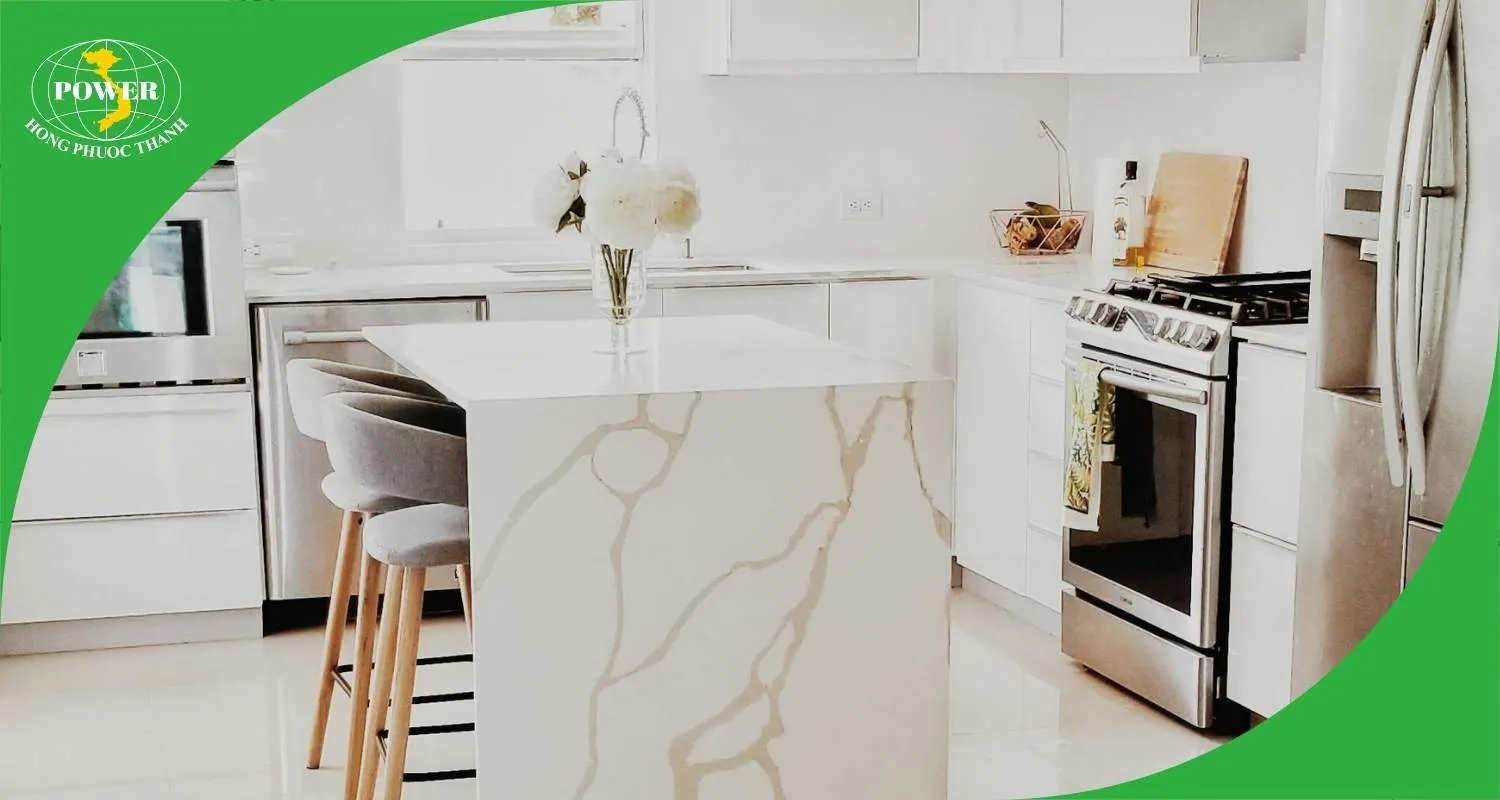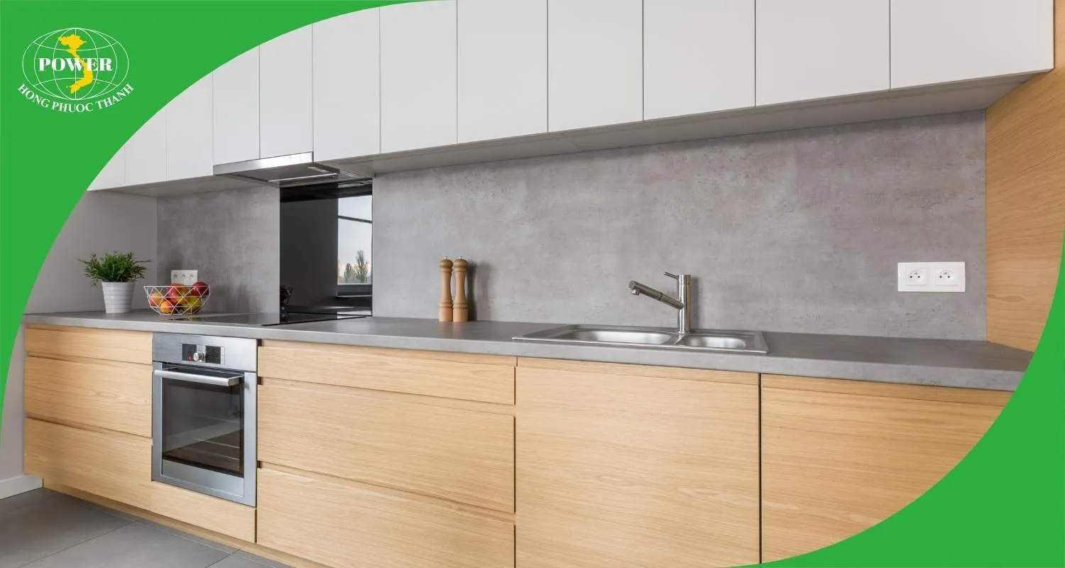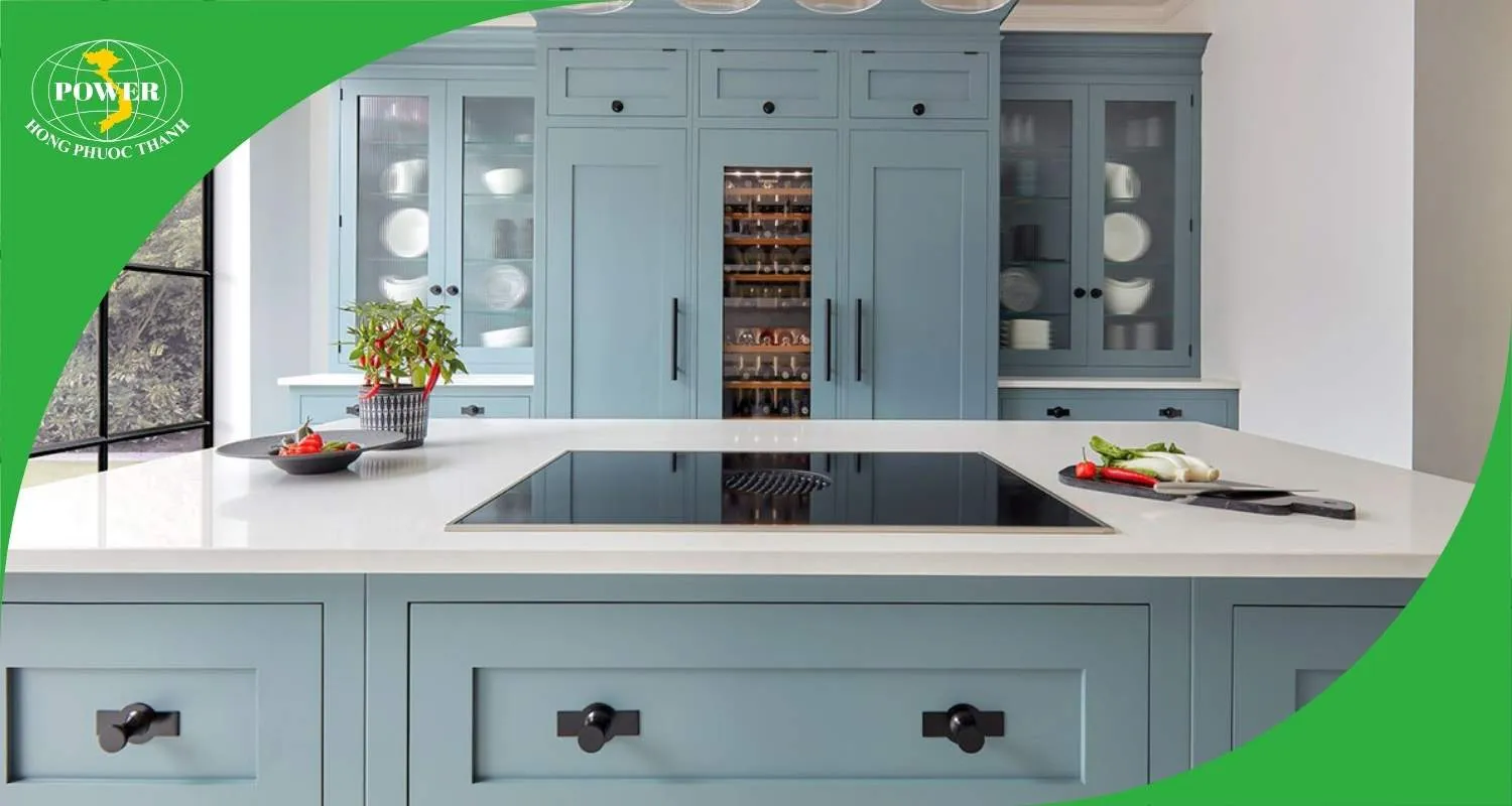 - Vật liệu chất lượng: Chẳng hạn như sử dụng tủ bếp có chất liệu là gỗ tự nhiên, mặt bếp được làm từ đá nhân tạo hay kính cường lực,…