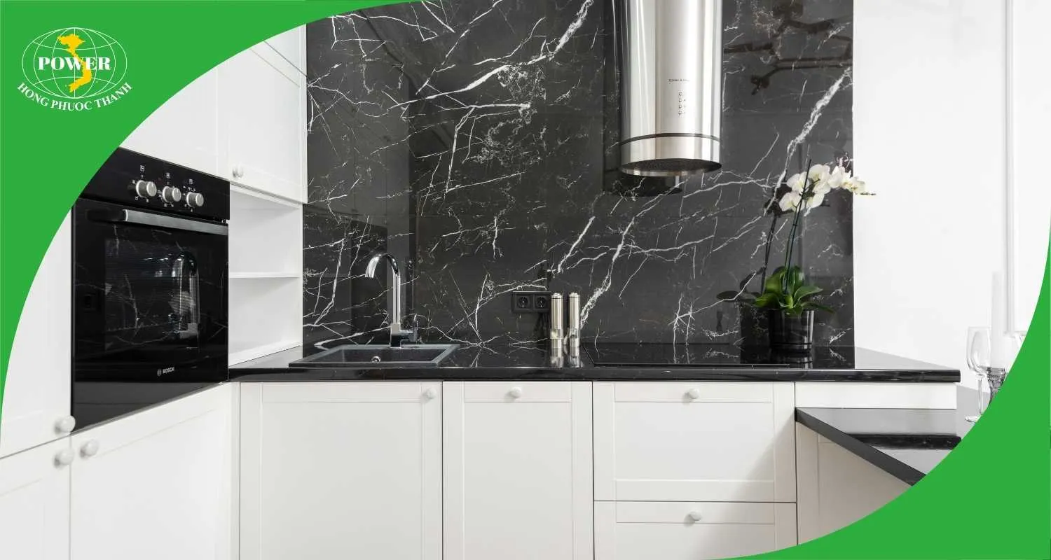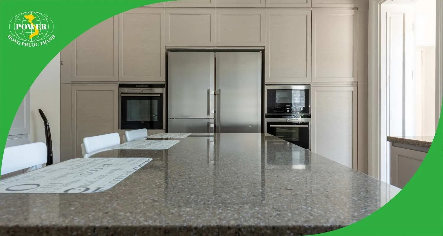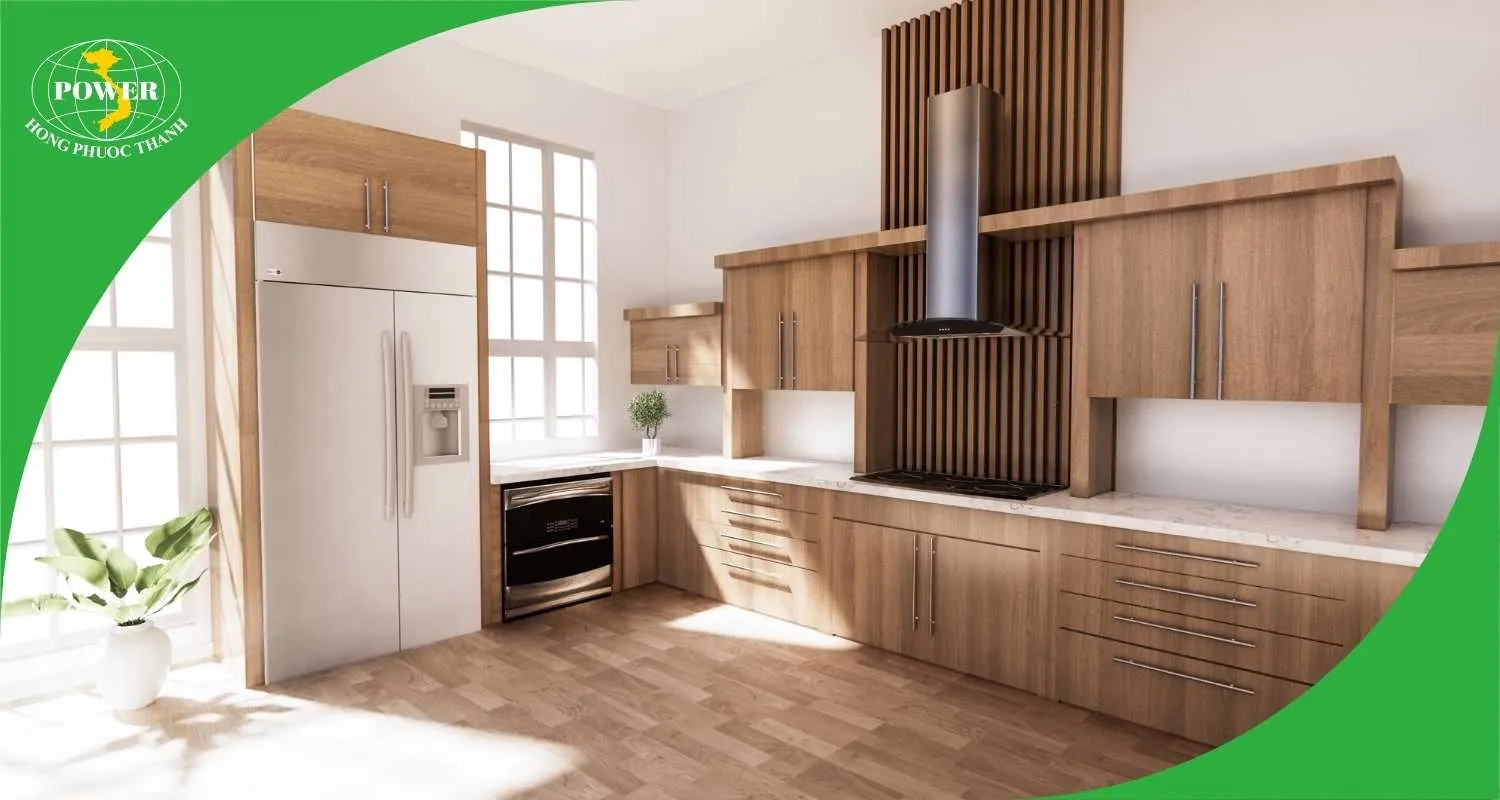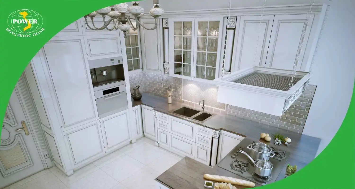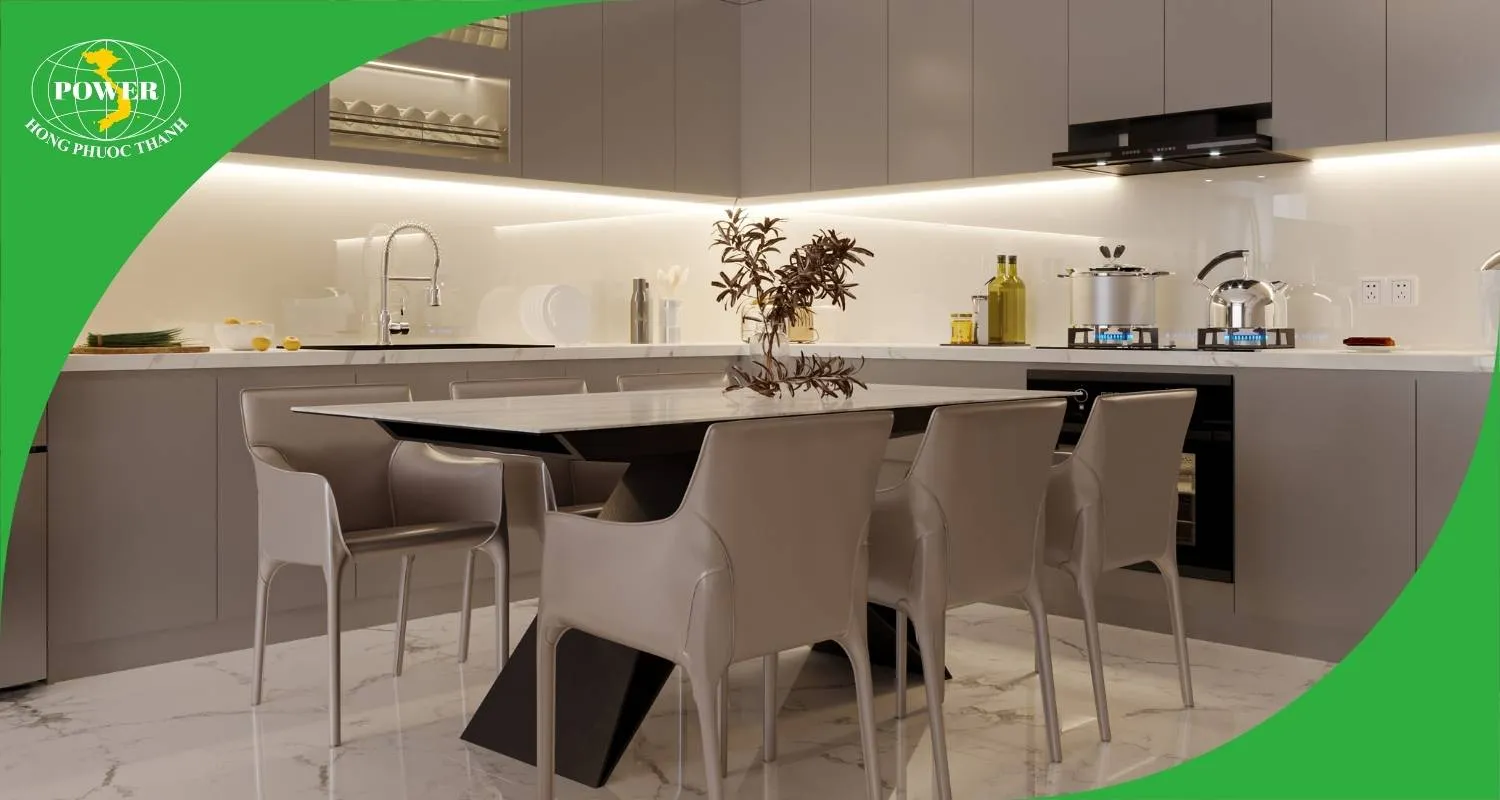 - Vật liệu chất lượng: Chẳng hạn như sử dụng tủ bếp có chất liệu là gỗ tự nhiên, mặt bếp được làm từ đá nhân tạo hay kính cường lực,…