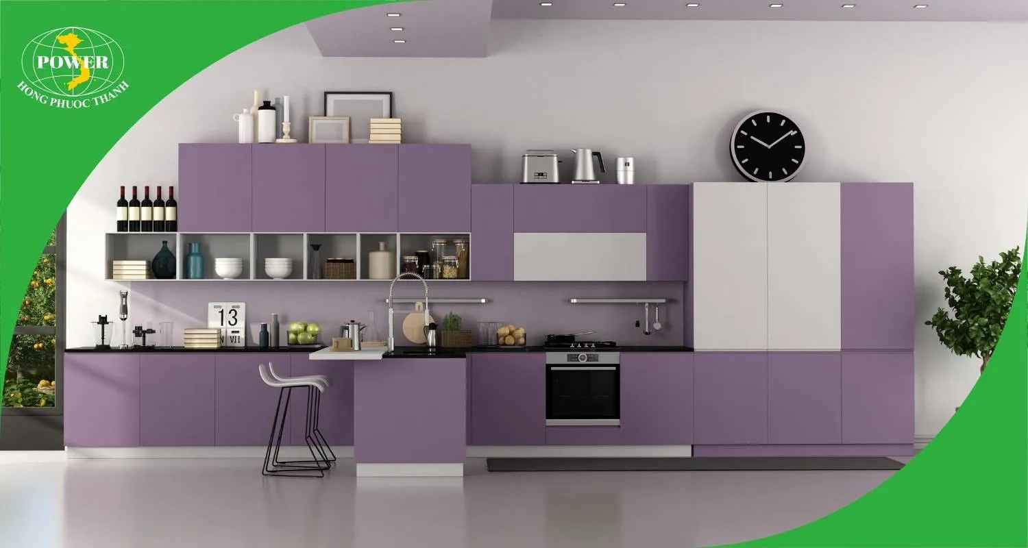 - Màu sắc hài hòa: Có thể sử dụng tông màu sáng để căn bếp trông thoáng hơn, hoặc nếu bạn muốn thể hiện vẻ sang trọng thì có thể dùng tông màu tối.